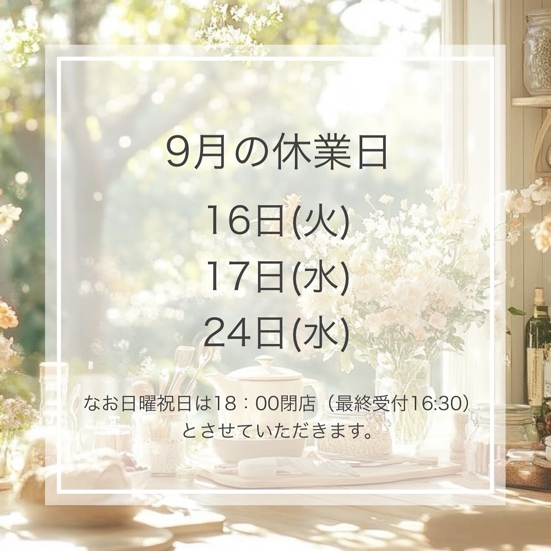 9月休業日 2025.08.26 9月の休業日・営業時間のお知らせです ■16日(火) ■17日(水) ■24日(水) なお日曜・祝日は18:00閉店(16:30最終受付) とさせていただきます。 よろしくお願いいたします。 Tweet Share Pin it 8月のキャンペーン ポイントサービス変更のお知らせ