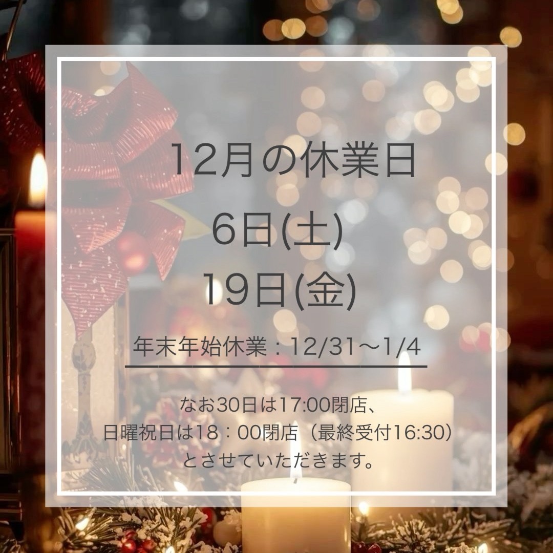 12月休業日 2025.11.30 12月および年末年始の休業日・営業時間のお知らせです ■6日(土) ■19日(金) ■12/31(水)~1/4(日) なお30日(火)は17:00閉店、 日曜・祝日は18:00閉店(16:30最終受付) とさせていただきます。 よろしくお願いいたします。 Tweet Share Pin it 11月のキャンペーン 12月のキャンペーン