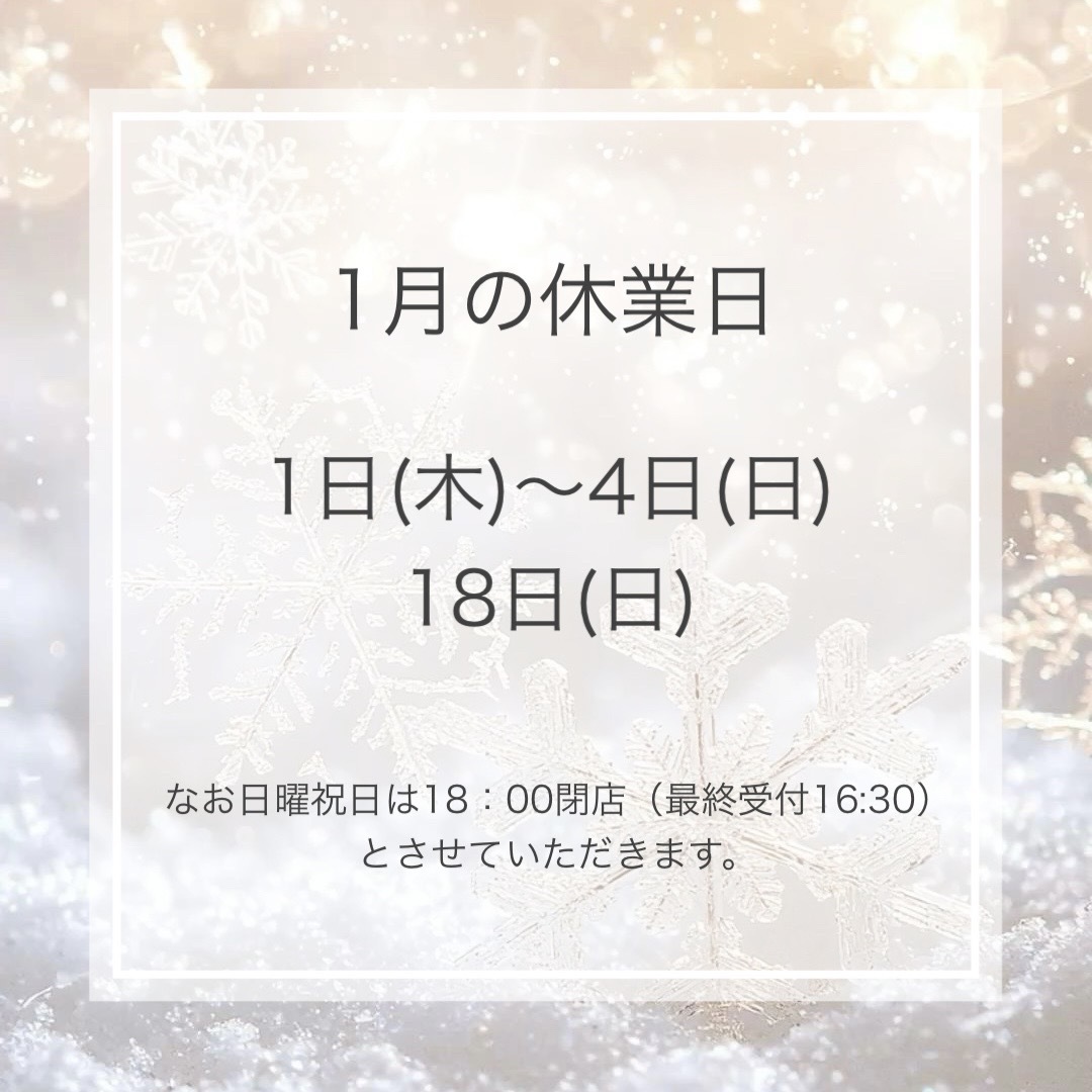 1月休業日 2025.12.27 1月の休業日・営業時間のお知らせです ■1/1(木)~1/4(日) ■18日(日) なお日曜・祝日は18:00閉店(16:30最終受付) とさせていただきます。 よろしくお願いいたします。 Tweet Share Pin it 12月のキャンペーン 1月のキャンペーン