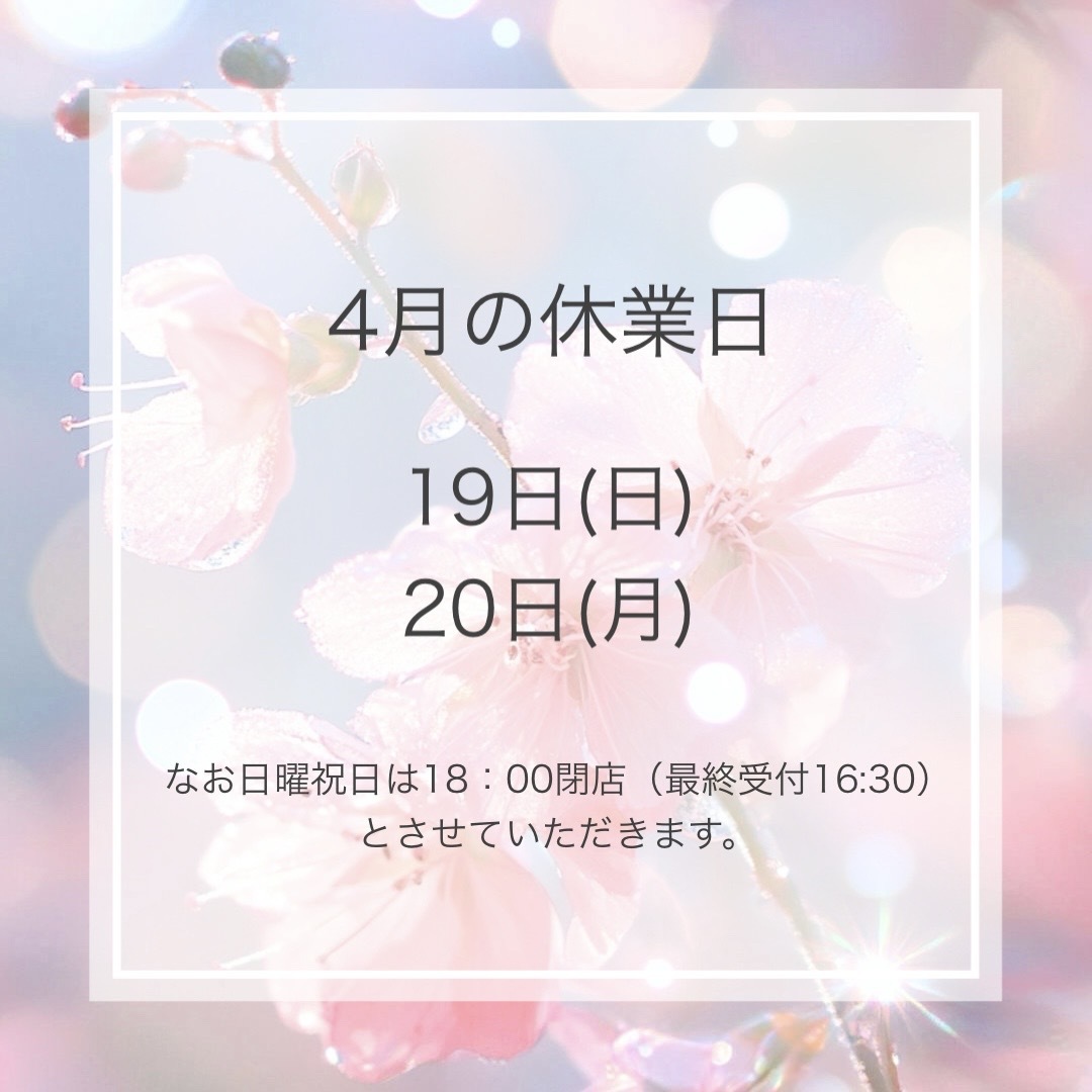4月休業日 2026.03.26 4月の休業日・営業時間のお知らせです ■19日(日) ■20日(月) なお日曜・祝日は18:00閉店(16:30最終受付) とさせていただきます。 よろしくお願いいたします。 Tweet Share Pin it 3月のキャンペーン